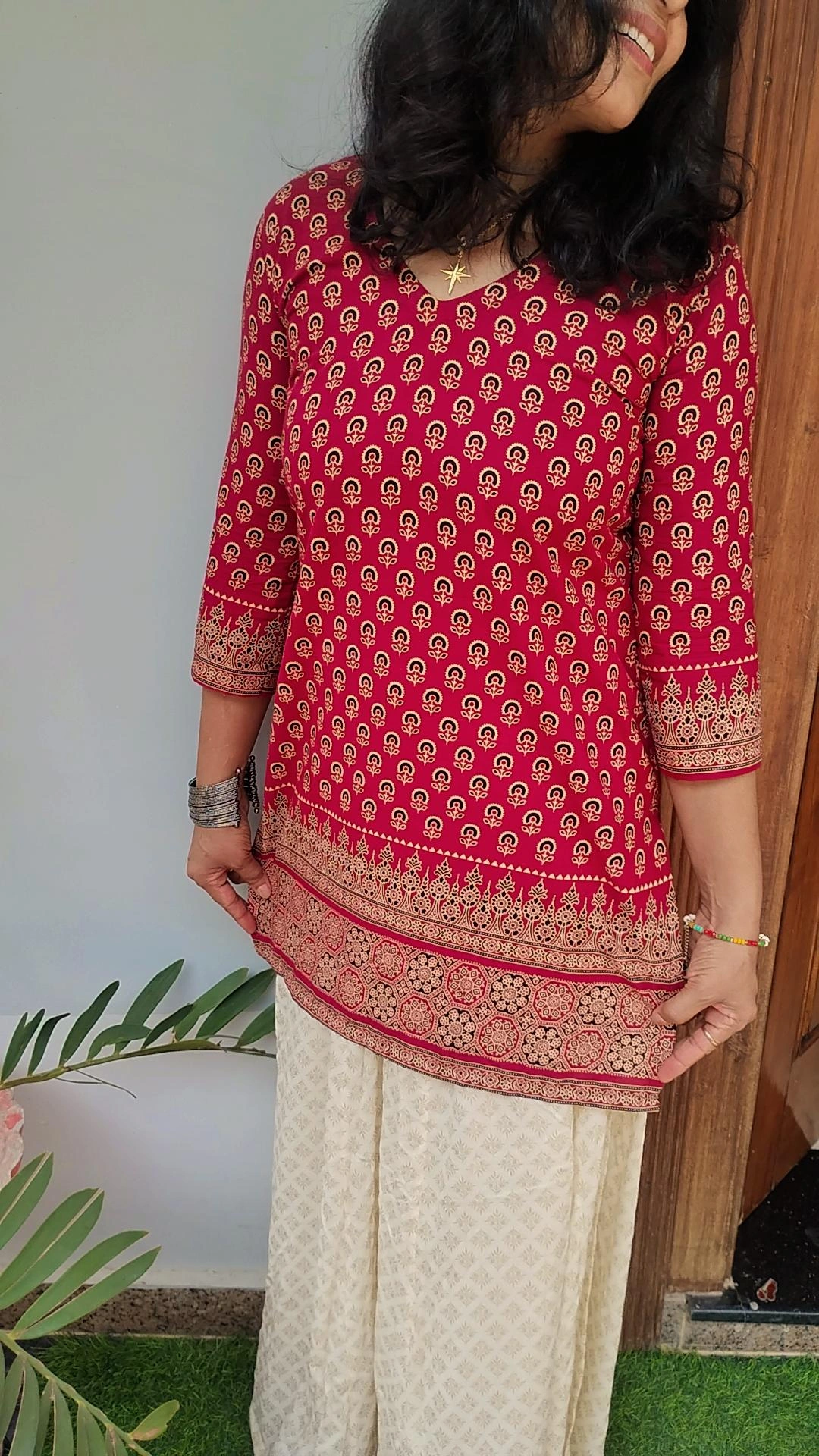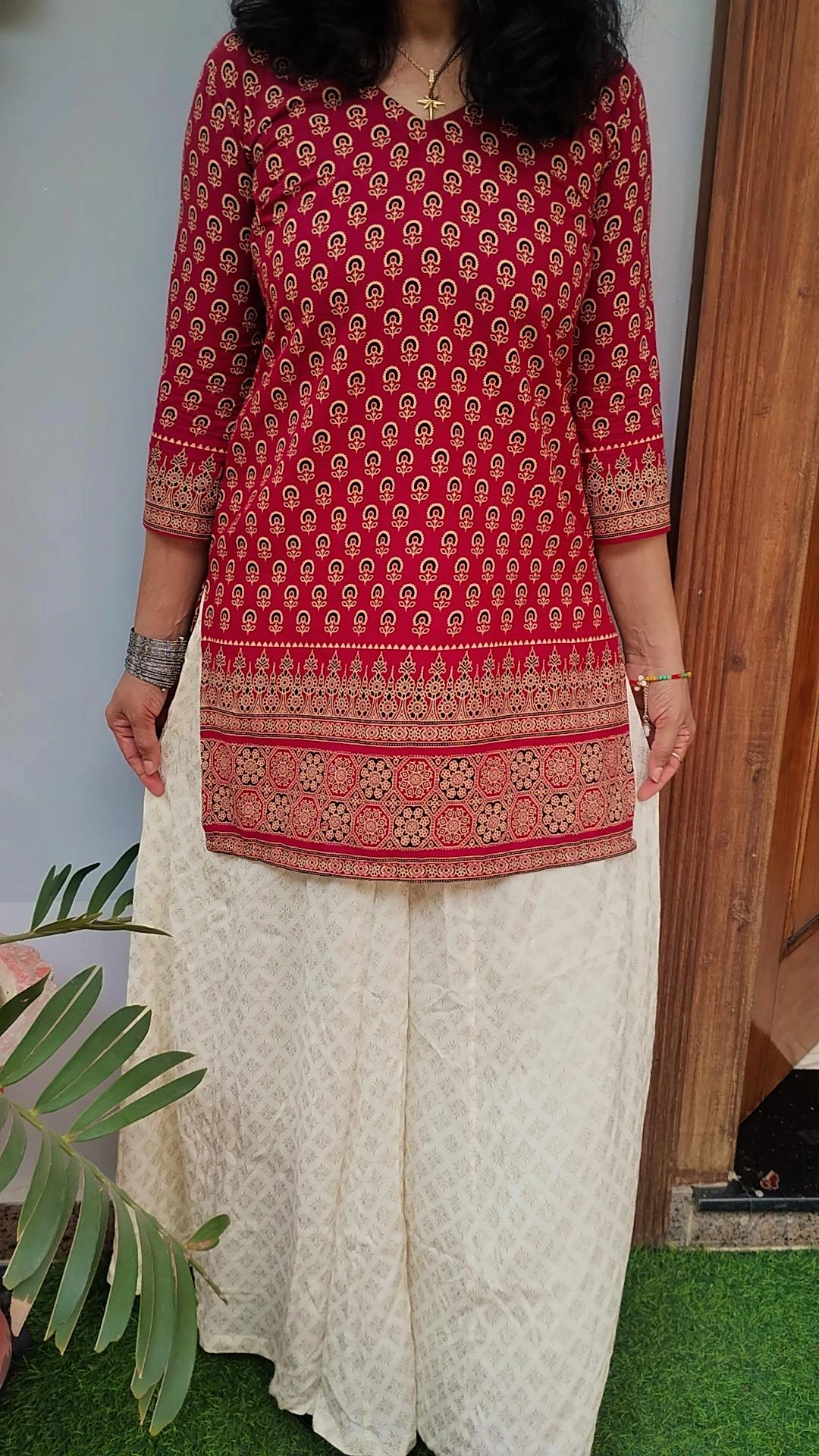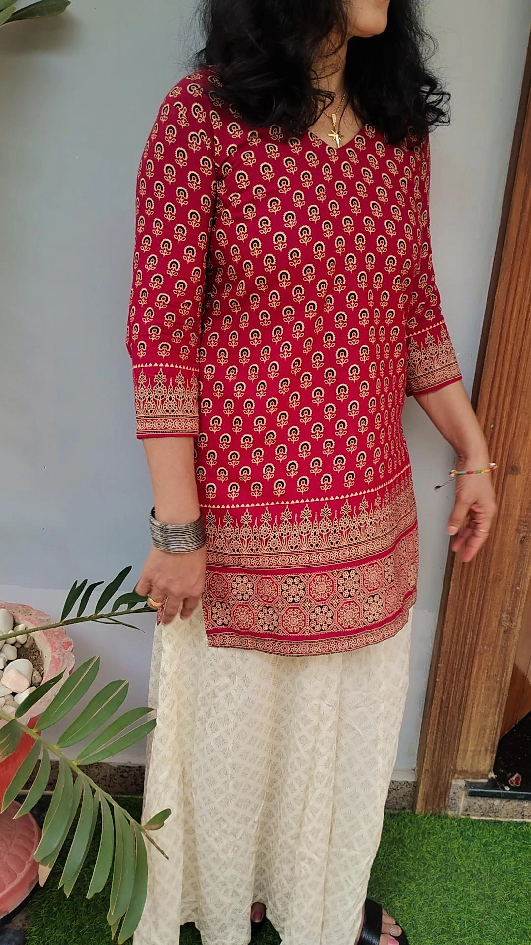 Hand block printed kurta set. The rich maroon kurta features intricate golden motifs with a beautifully designed border on the hem and sleeves, giving it a traditional yet classy touch.